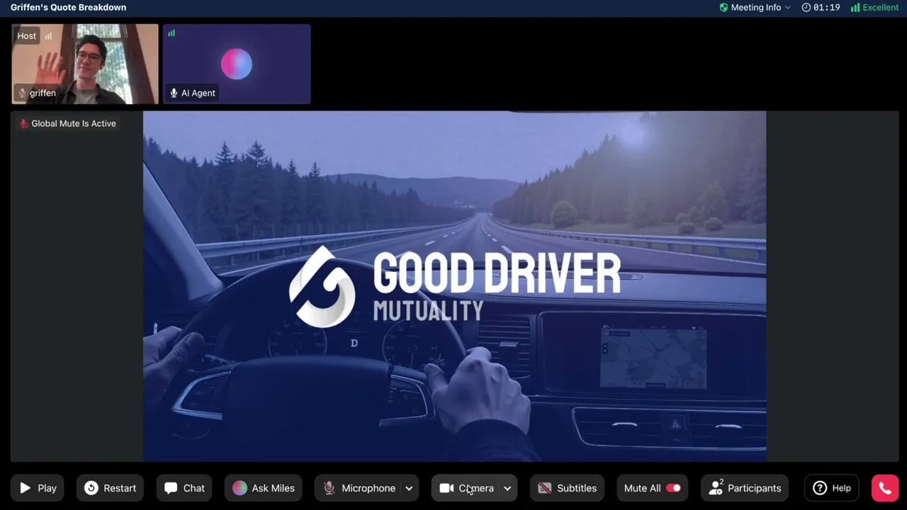 Miles's product presentation is hosted in a GDM online meeting environment, accessed via a unique link corresponding to a specific quote.