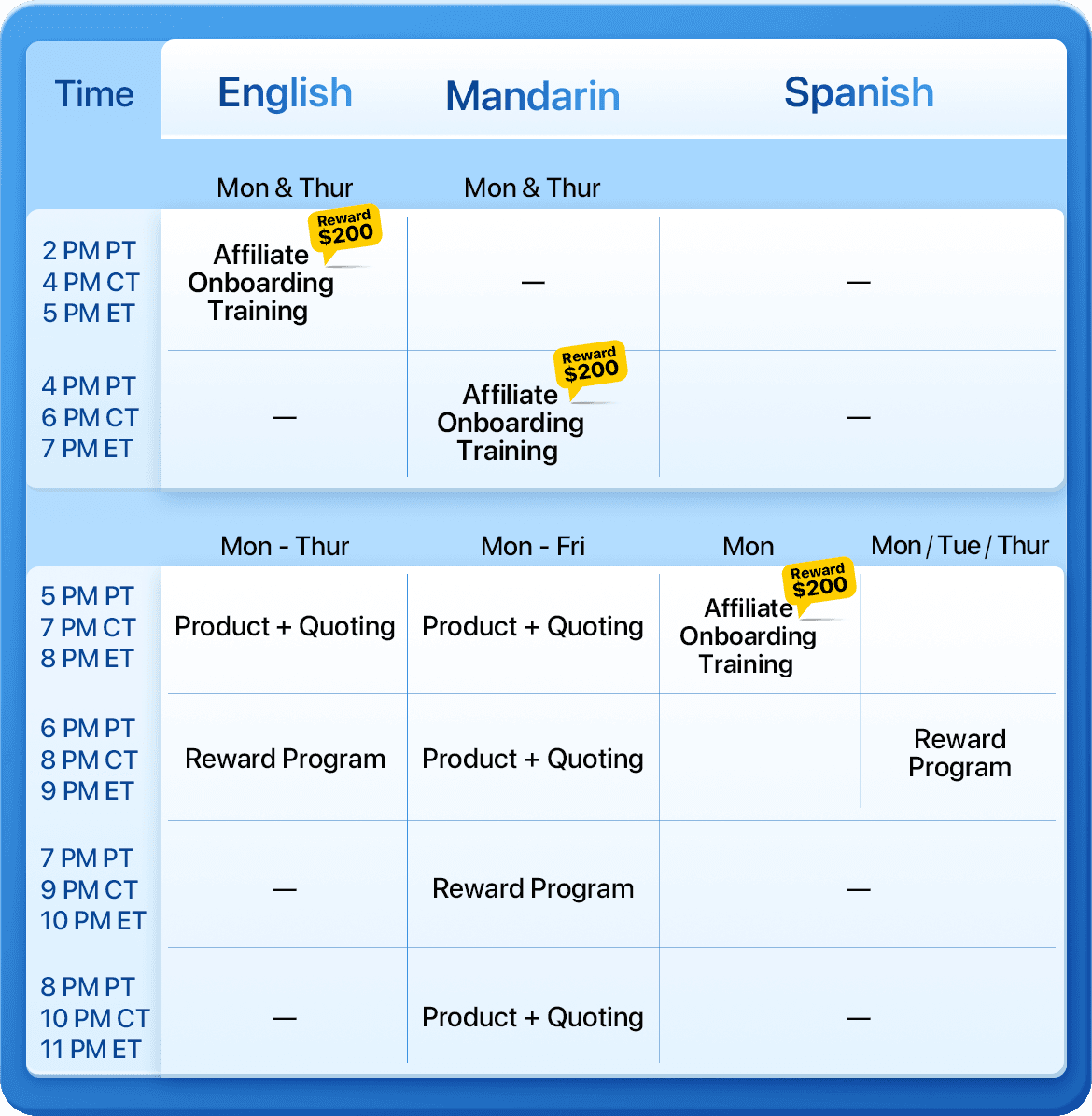 *Weekly Schedule: Please note the session times and time zone arrangements for the English, Spanish, and Chinese sessions.