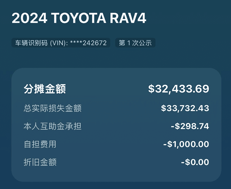 对社区: 拍卖净收益返还社区,用于支持未来互助事件。因此,本次事故按全损认定,相比维修方案,有效降低了全体会员的整体分摊金额。